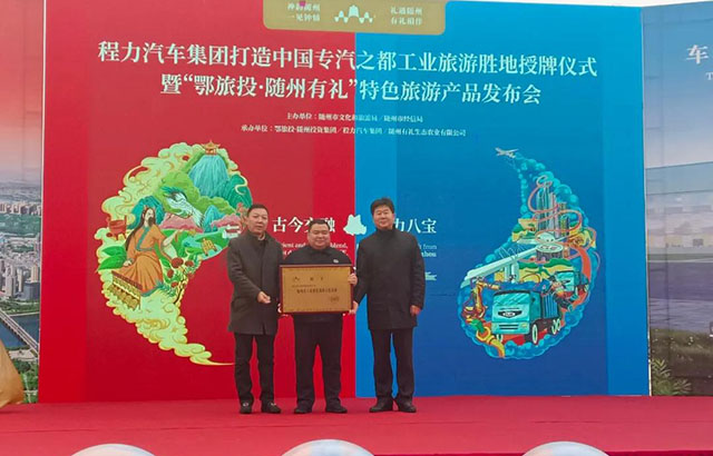 在慶典活動(dòng)現(xiàn)場(chǎng),隨州市政府汪新國(guó)秘書長(zhǎng)(左)、市文化和旅游局汪海濤局長(zhǎng)(右),向程力汽車集團(tuán)股份有限公司程阿羅總經(jīng)理同志(中),頒發(fā)“隨州市工業(yè)旅游創(chuàng)新示范基地”匾牌。