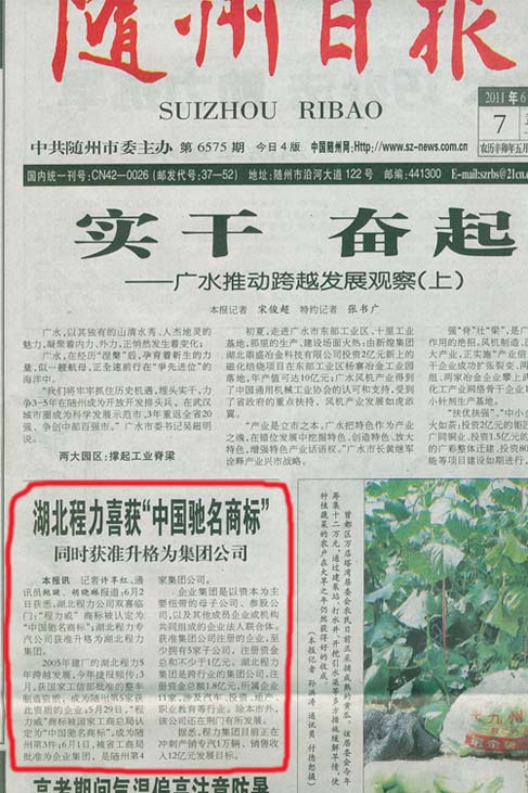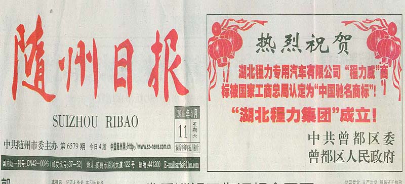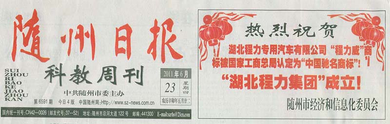 2005年建廠的湖北程力5年跨越發(fā)展,今年捷報(bào)頻傳:3月,獲國家工信部批準(zhǔn)的整車制造資質(zhì),成為隨州第5家獲此資質(zhì)的企業(yè);5月29日,“程力威”商標(biāo)被國家工商總局認(rèn)定為“中國馳名商標(biāo)”,成為隨州第3件;6月1日,被省工商局批準(zhǔn)為企業(yè)集團(tuán),是隨州第4家集團(tuán)公司。