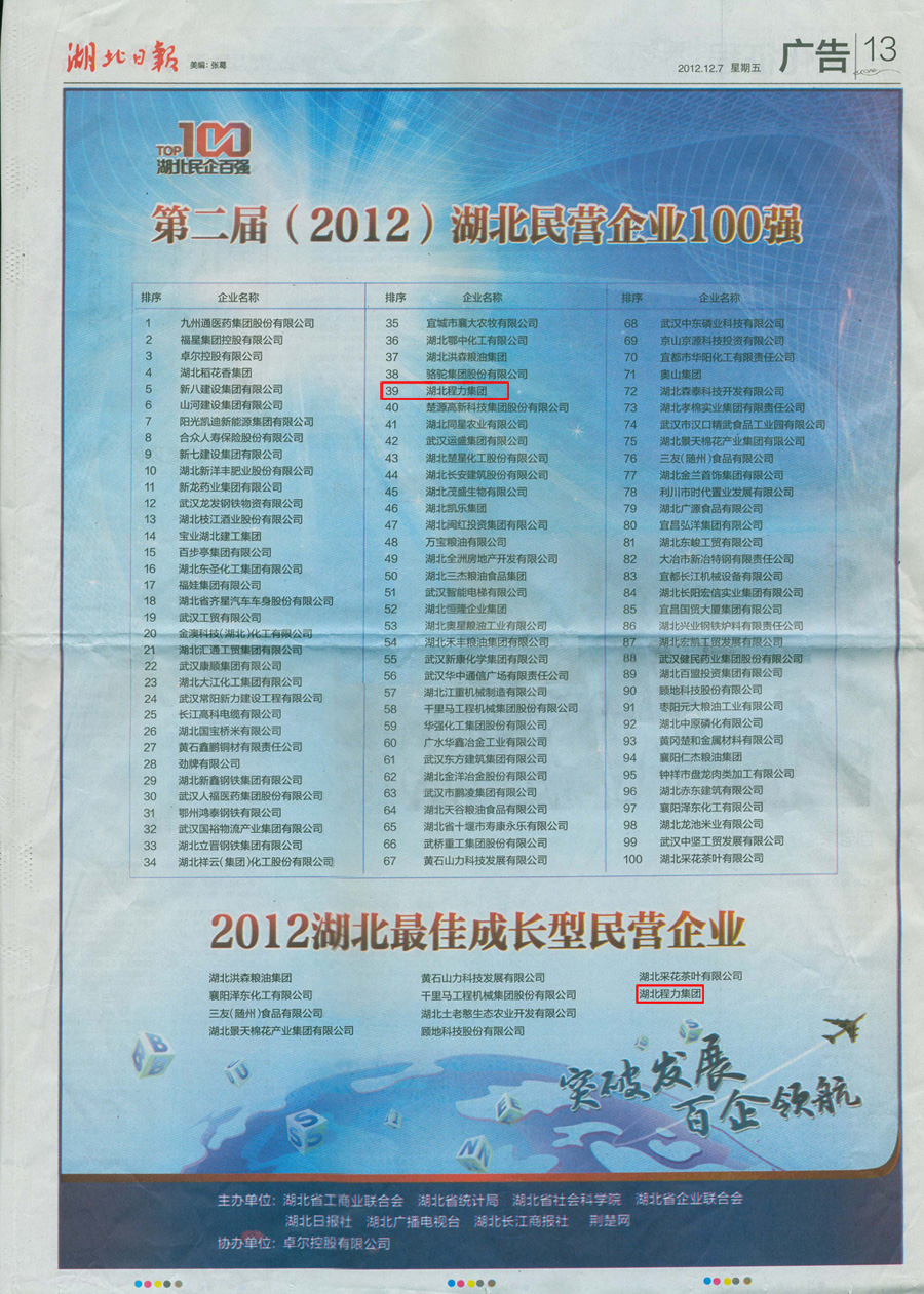 由湖北省工商業(yè)聯(lián)合會(huì)、湖北省統(tǒng)計(jì)局、湖北省社會(huì)科學(xué)院等單位舉辦的第二屆(2012)湖北民 營(yíng)企業(yè)100強(qiáng),昨天在湖北省民營(yíng)企業(yè)100強(qiáng)出爐,湖北程力集團(tuán)榜上有名。