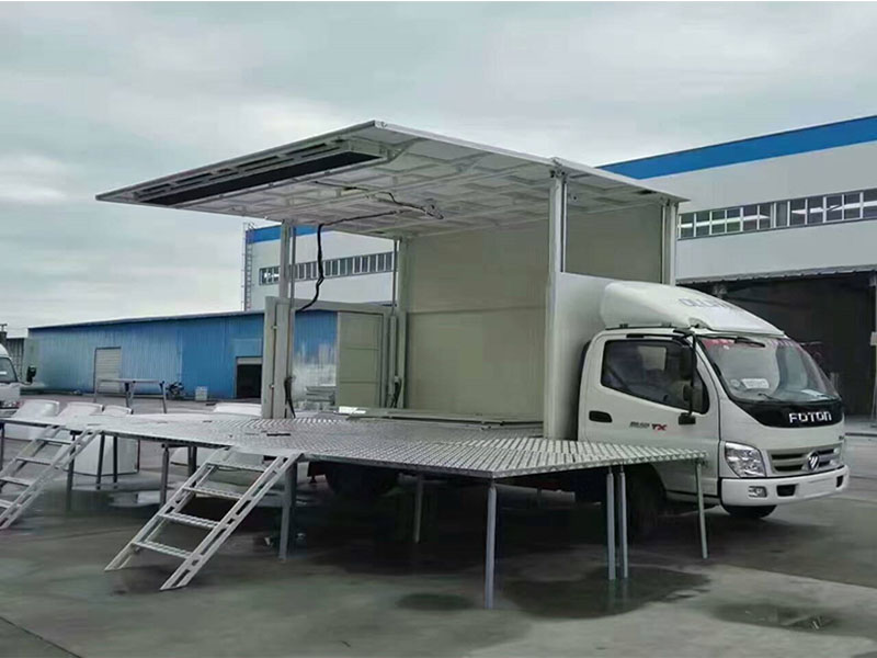 流動舞臺車(英文:Flow stage car)是一種方便流動演出,可展開成為舞臺的特種汽車;新式流動舞臺車搭配有LED顯示屏也叫LED流動舞臺車。全自動流動舞臺車箱體是通過機(jī)械裝置自動展開、搭建成具有頂棚和舞臺板的演出舞臺,并配備安裝舞臺燈光、音響、電源接口、自動控制系統(tǒng)等設(shè)備的專用車。流動舞臺車上裝舞臺廂體整體采用鋁型材和沖壓件組合骨架,外板為鋁合金平板,內(nèi)飾為防水膠合板,程力舞臺車的舞臺板采用防水、防滑、防火的腹面膠合板;側(cè)板和頂板分別由四個液壓油缸控制展開即成舞臺的臺頂,底板展開四個液壓油缸控制成舞臺,省去傳統(tǒng)搭臺程序,省時省力操作簡便安全可靠,功能齊全,外觀美觀。